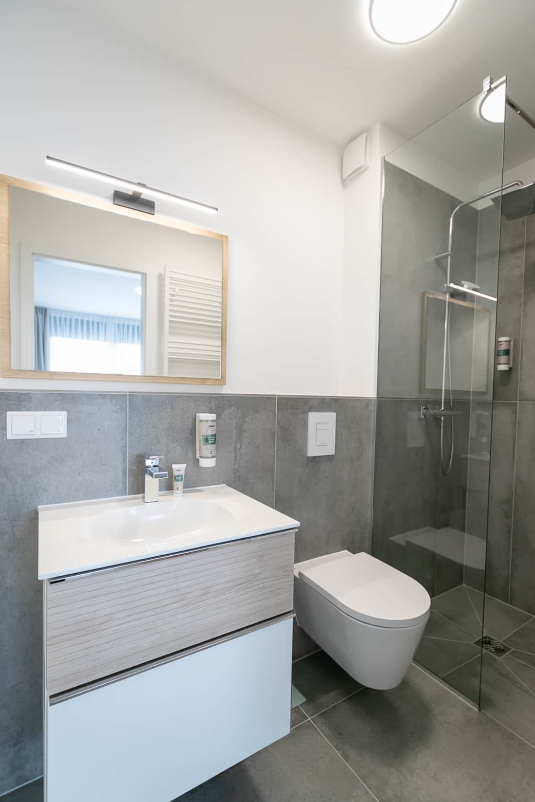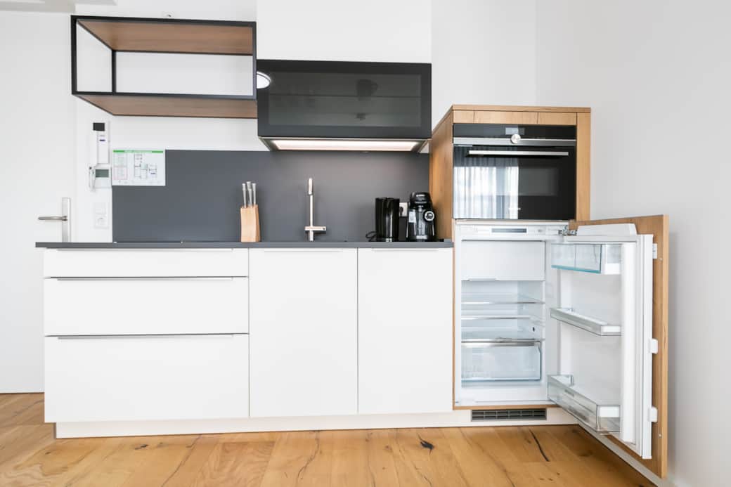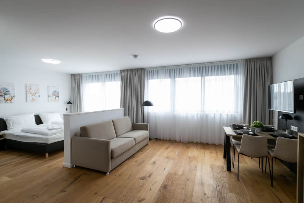 A modern bathroom with fluffy towels, Toiletries, hairdryer and a walk-in shower with rain shower. A full equipped kitchen with built-in compact oven, dishwasher, Induction hob, refrigerator, Tassimo coffee machine and a lovely, high-quality and extensive equipment with crockery and cutlery. The Dining table with separate table lamp is also ideal for your business. On the comfortable sofa bed you can relax and end the day with a beautiful book. By simply folding the Sofa bed - with an internal mattress, the studio apartment is suitable also ideal for 4 people.