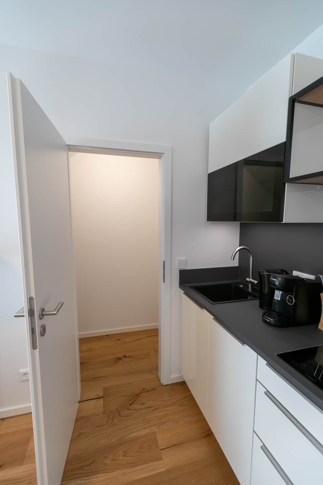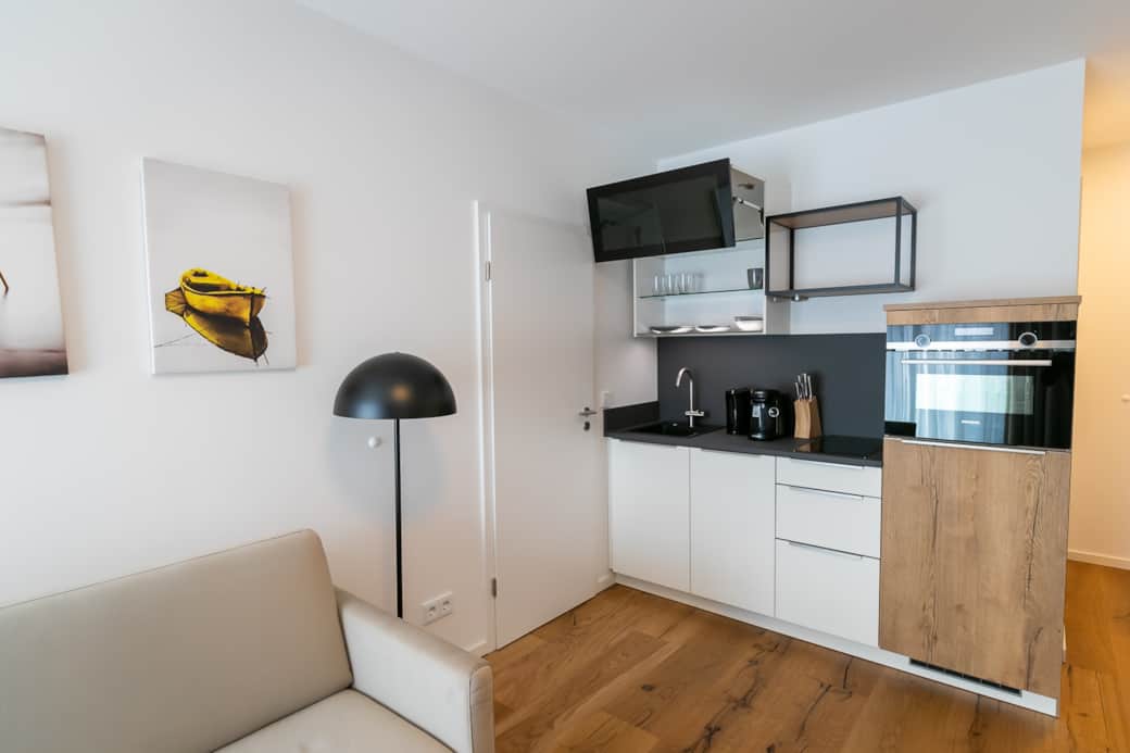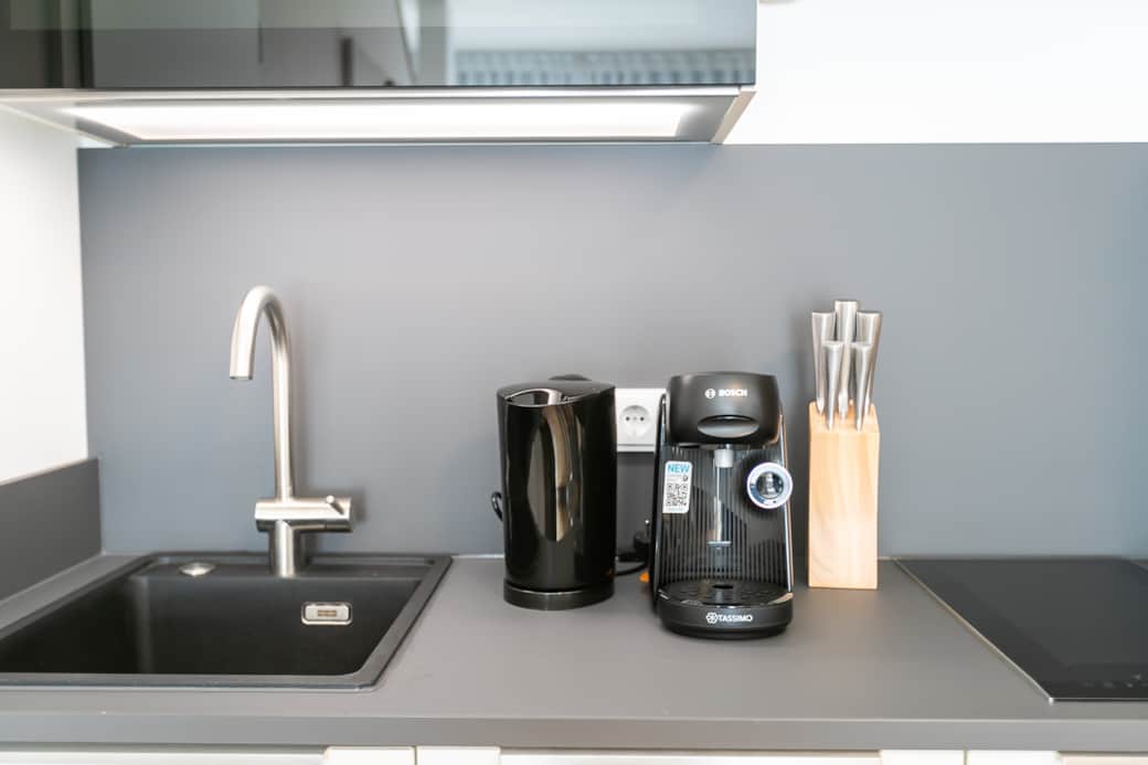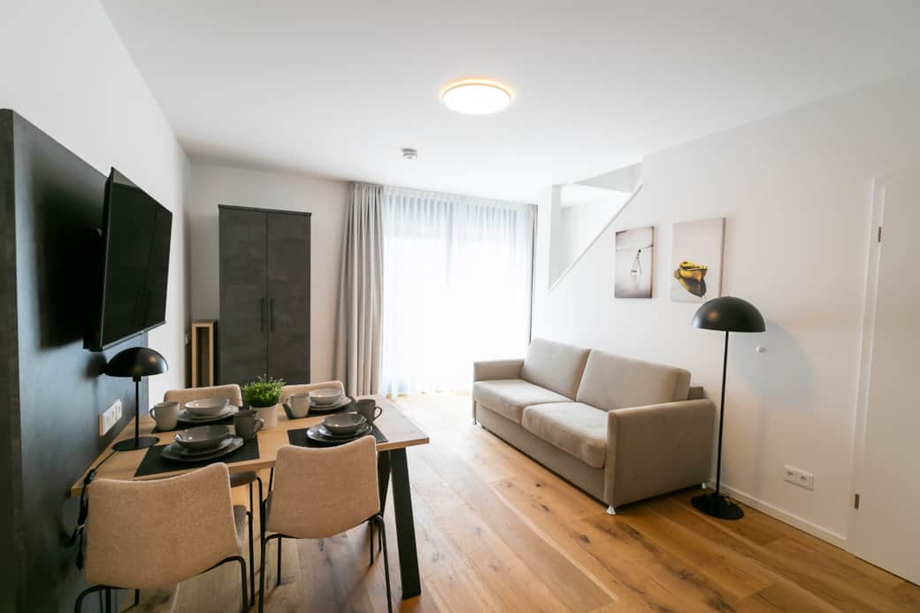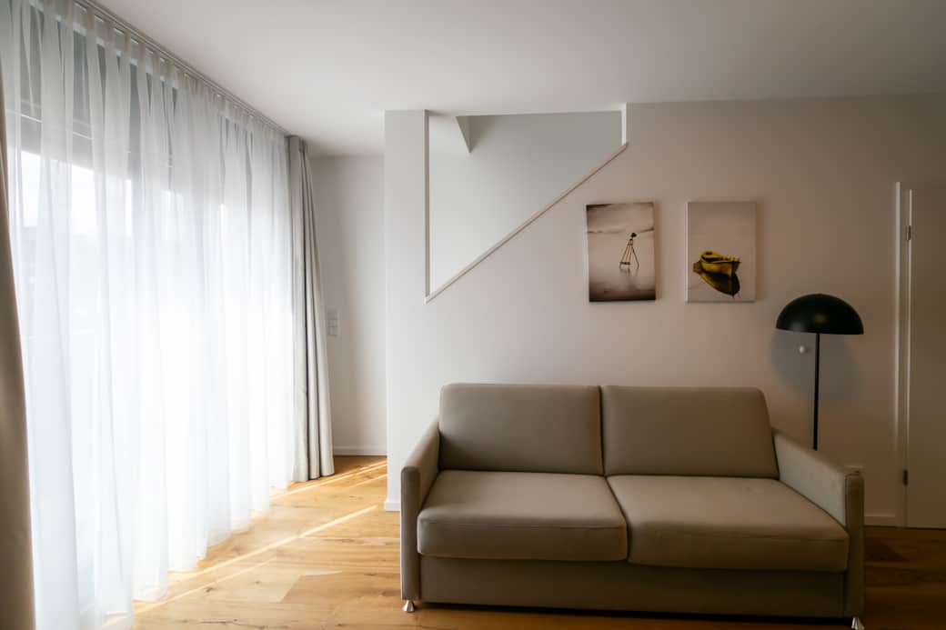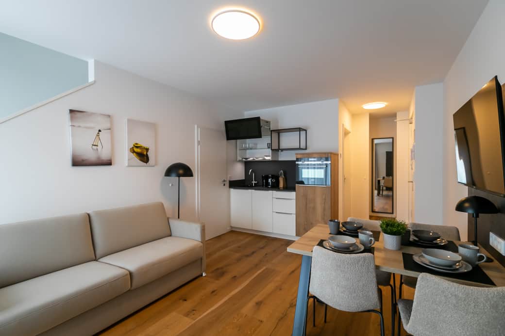 On the lower floor, you will find a light-flooded and modern living and dining area with a modern sofa bed and a dining table. On this level, you can cook, eat and chill together and end the day with a games evening. The lower bathroom is equipped with fresh towels, care products, a hairdryer and a walk-in shower/rain shower. A towel radiator is available for drying your towels. You can relax comfortably on the comfortable sofa bed or stream the latest and best entertainment programs such as Netflix, RTL+ and Disney+ via Magenta TV on the 42-inch flat screen TV. This beautiful loft apartment is also suitable for 4 people by simply folding down the sofa bed with an internal mattress. The adjoining fully equipped kitchen has a built-in compact oven, dishwasher, induction hob, refrigerator, Tassimo coffee machine and a lovingly designed, high-quality and extensive range of crockery and cutlery.